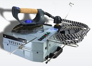 Dampferzeuger mit Dampfregler, Bügeleisen, Teflonsohle, Ablagegitter, Silikonmatte und Kabelhalterung.