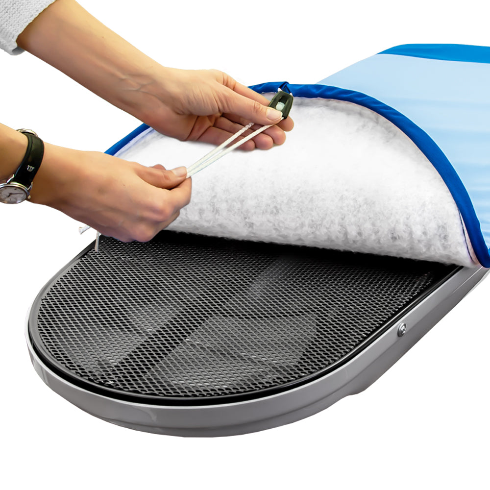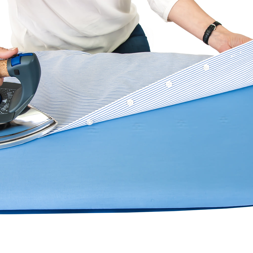Der neue Bügeltischbezug ist besonders für Dampfdruckbügelsysteme entwickelt worden. Die 6 Millimeter starke Stoffpolsterung mit speziellen Kanälen im Bezug, sorgt für die Ableitung des Dampfes und somit für eine trockenere Bügelfläche. Diese Kanäle bewirken auch eine effektive Aufblasfunktion beim Bügeln von leichten Stoffen und Kleidung mit Futter. Die spezielle weiche Stoffpolsterung sorgt auch dafür, dass das Bügeln besonders komfortabel ist. Hässliche Druckstellen, die beispielsweise von Knopfleisten auf der Rückseite des Hemdes oder der Bluse entstehen können, werden so vermieden und Ihre Kleidung wird besonders geschont.